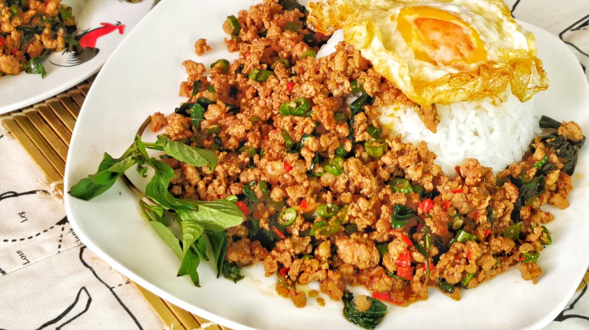 A popular street food dish, Pad Kra Pao is stir-fried meat (usually pork or chicken) cooked with holy basil, garlic, and chili, served with rice and a fried egg on top.